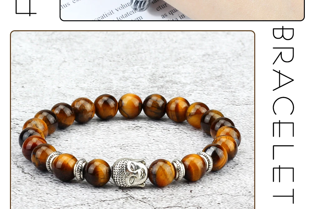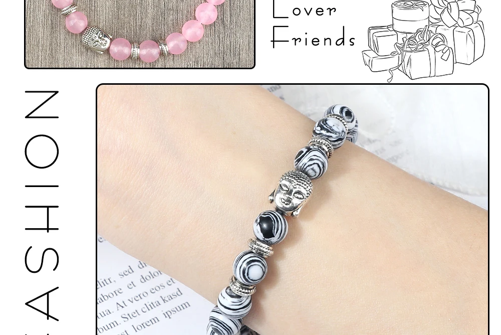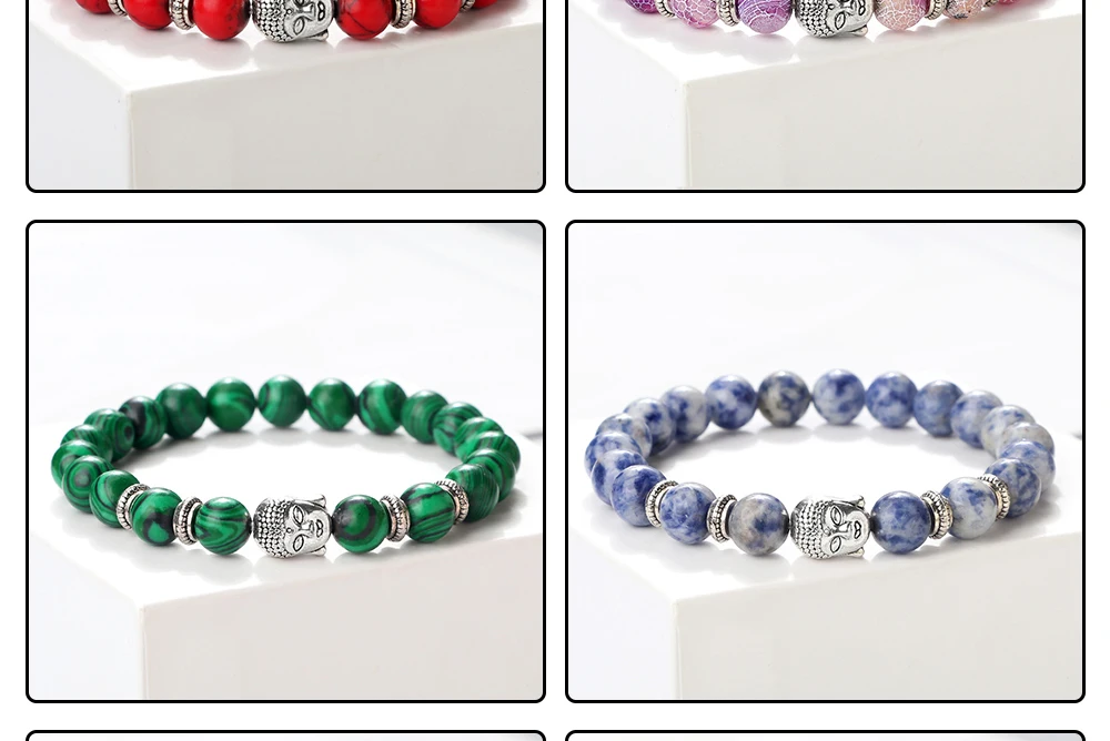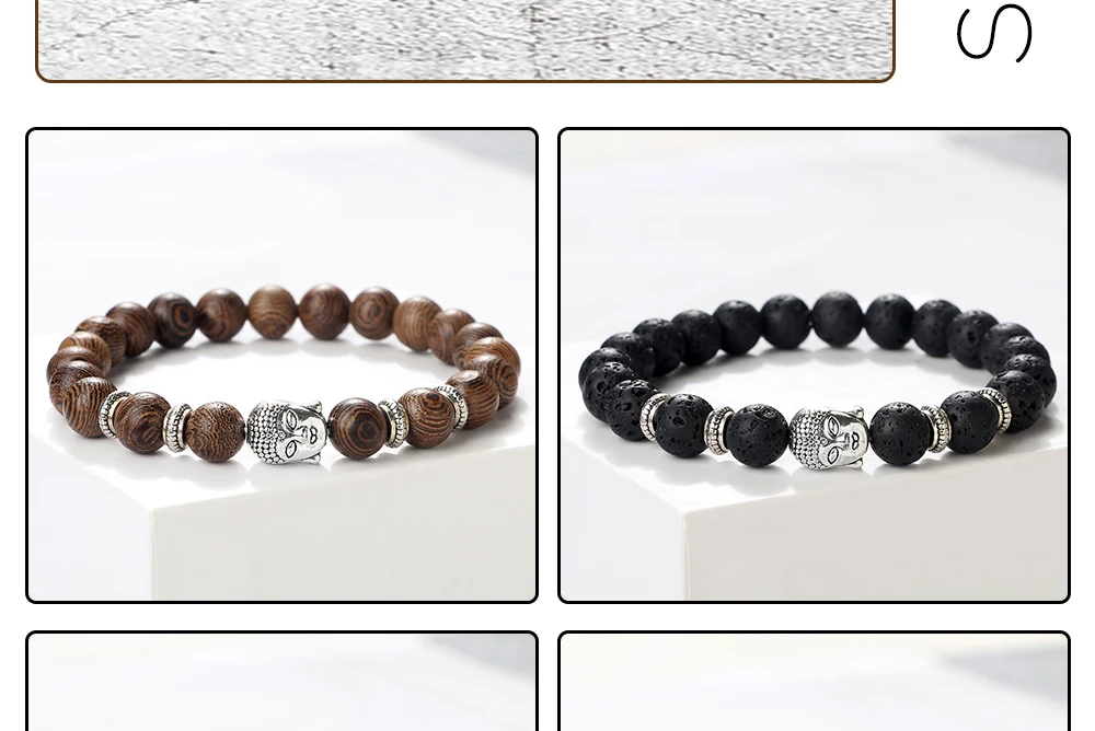 Cette collection comprend notamment des bracelets avec têtes de Bouddha, en pierres naturelles telles que l’œil de tigre, la roche volcanique, la malachite et le quartz rose, parfaits pour offrir ou porter au quotidien.